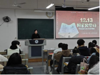 活动伊始,陈思意同志围绕PPT四大核心板块展开详细讲解。她从国家公祭日的设立背景切入,介绍了2014年全国人大常委会正式将12月13日设立为南京大屠杀死难者国家公祭日的立法历程,让大家深刻认识到这一举措是国家意志的体现。随后,通过珍贵史料、详实数据和震撼案例,她还原了1937年南京大屠杀的黑暗历史:日军六周内屠杀30万手无寸铁的军民,集体射杀、活埋、纵火等暴行惨绝人寰,《远东国际法庭判决书》等史料铁证如山,向井敏明与野田毅的“杀人竞赛”更是暴露了侵略者的野蛮本质。在公祭活动介绍环节,她生动描述了国家公祭仪式的庄重场景,总书记搀扶幸存者揭幕国家公祭鼎、中学生诵读《和平宣言》等细节,让在场同学深切感受到国家对历史的敬畏与对和平的珍视。最后,她阐释了公祭日设立的现实与深远意义,强调铭记历史不是延续仇恨,而是为了凝聚人心、守护和平,为民族复兴注入精神力量。