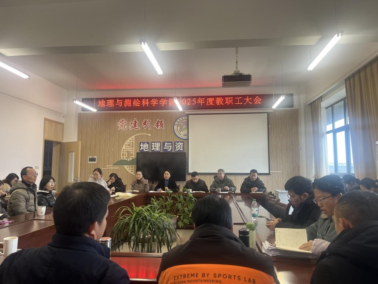2026年1月5日下午,地理与测绘科学学院在格致楼519会议室召开2025年度教职工大会。会议全面总结学院2025年度各项工作成效,系统部署2026年重点任务,听取并审议学院及工会工作报告与经费使用情况报告。学院党委书记黄平主持会议,全体教职工参会。