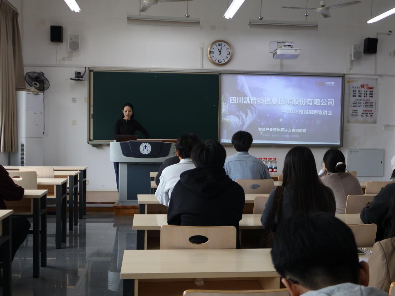 为拓宽我院学生就业渠道,搭建校企人才对接平台,2025年11月8日,在明德楼B121教室,我院举办四川里航科技集团有限公司、四川凯普顿信息技术股份有限公司两场校园招聘宣讲会,相关专业同学积极参与。