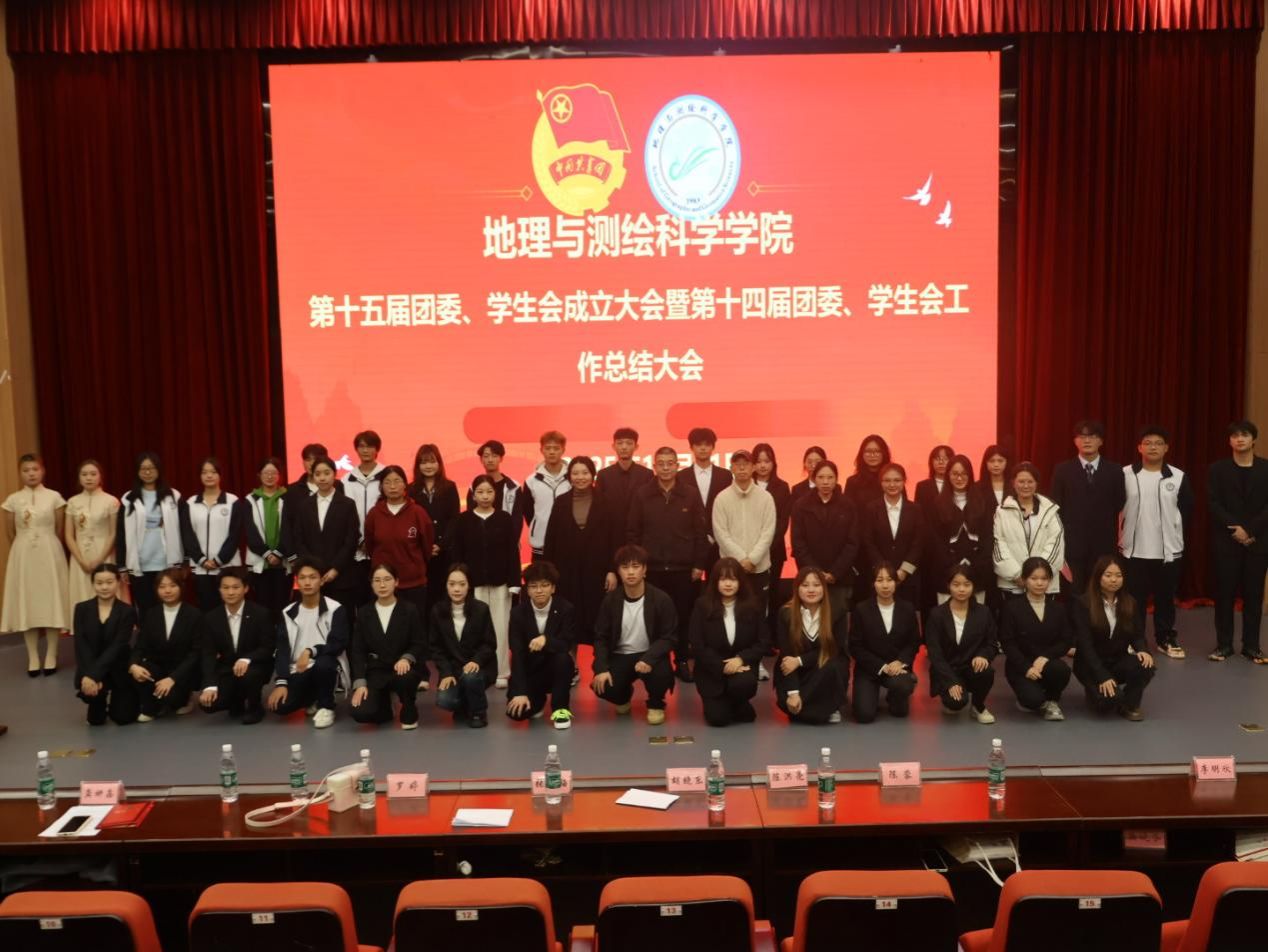 2025年11月11日,地理与测绘科学学院第十五届团委、学生会成立大会暨第十四届团委、学生会工作总结表彰大会于大千楼A102举行。学院党委副书记胡晓东,学工办副主任、团委副书记张小梅,学工办陈洪亮、陈蓉、罗婷老师,学院团委、学生会成员共同参与本次大会。