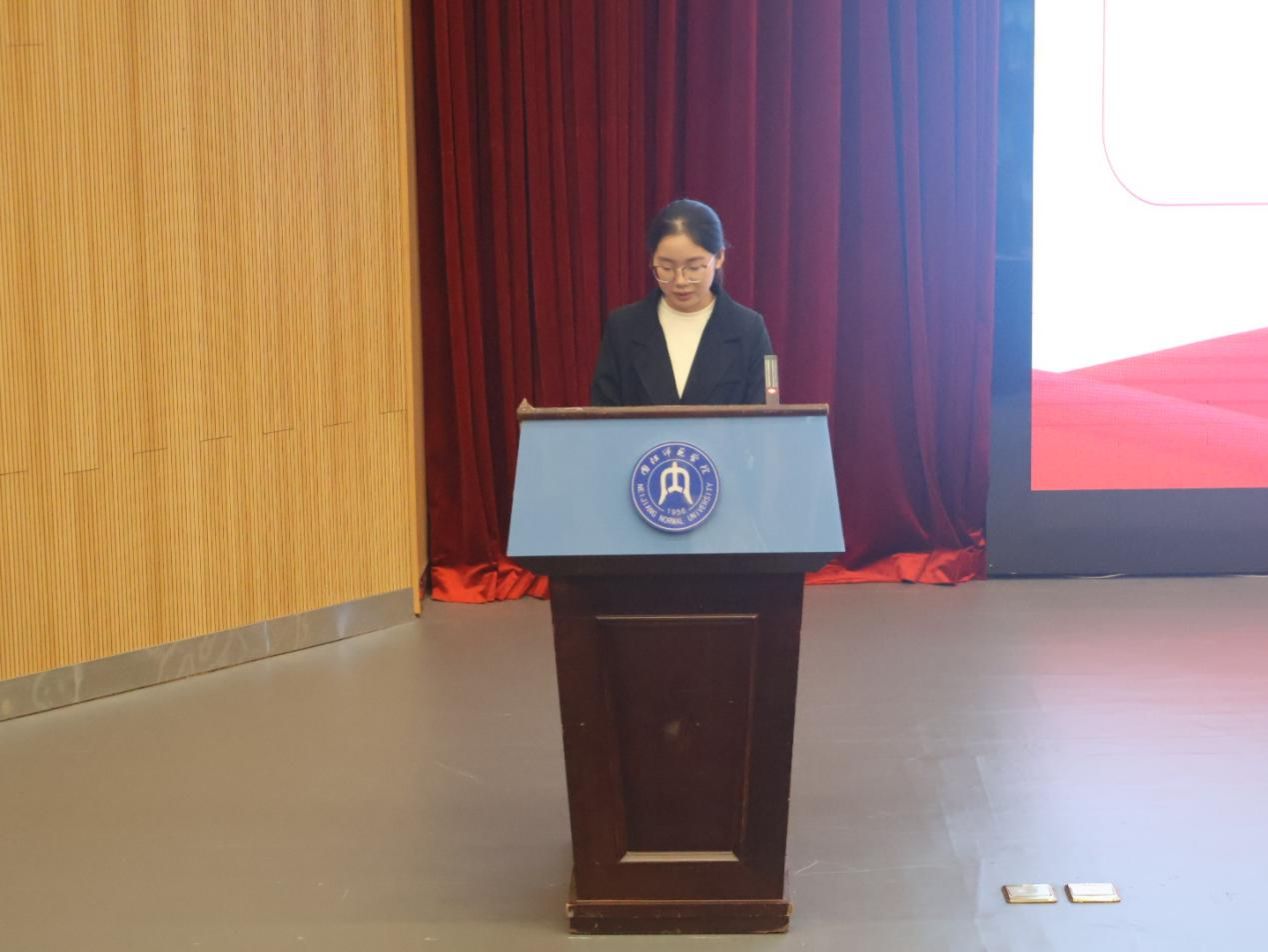 “齐唱团歌”环节用一首嘹亮的歌声点燃了同学们的热情,学工办副主任、团委副书记张小梅对十四届团委学生会的工作与成绩给予高度肯定,对新一届团委学生会成员寄予鼓励与支持。表彰环节,老师们为第十四届团委、学生会颁发聘书及纪念本,表彰第十四届团委学生会先进工作者,感谢他们努力工作的激情和无私奉献的精神。随后,先进工作者代表赵信和袁圆及第十五届团委、学生会主席团代表龚妍鑫上台分享经验。赵信结合经历谈到,学生工作的核心是“担当”与“实绩”,明确职责、直面挑战,用实绩诠释责任才是其价值所在;袁圆分享实操心得,做好学生工作要抓细节、重沟通、扛责任,以严谨态度化解问题;龚妍鑫表示,将立足服务宗旨,为建设学院信赖、同学满意的优秀学生组织不懈奋斗。之后,第十五届团委学生会各部门上台进行自我介绍,展现了各部门风貌。最后,学院党委副书记胡晓东进行总结发言。他代表党委对十四届团委、学生会为学院发展作出的贡献表示感谢,强调第十五届团委学生会承载着学院领导与老师的殷切期望,也肩负着全体同学的信任与重托,希望能以身作则,促进全体成员共勉成长。