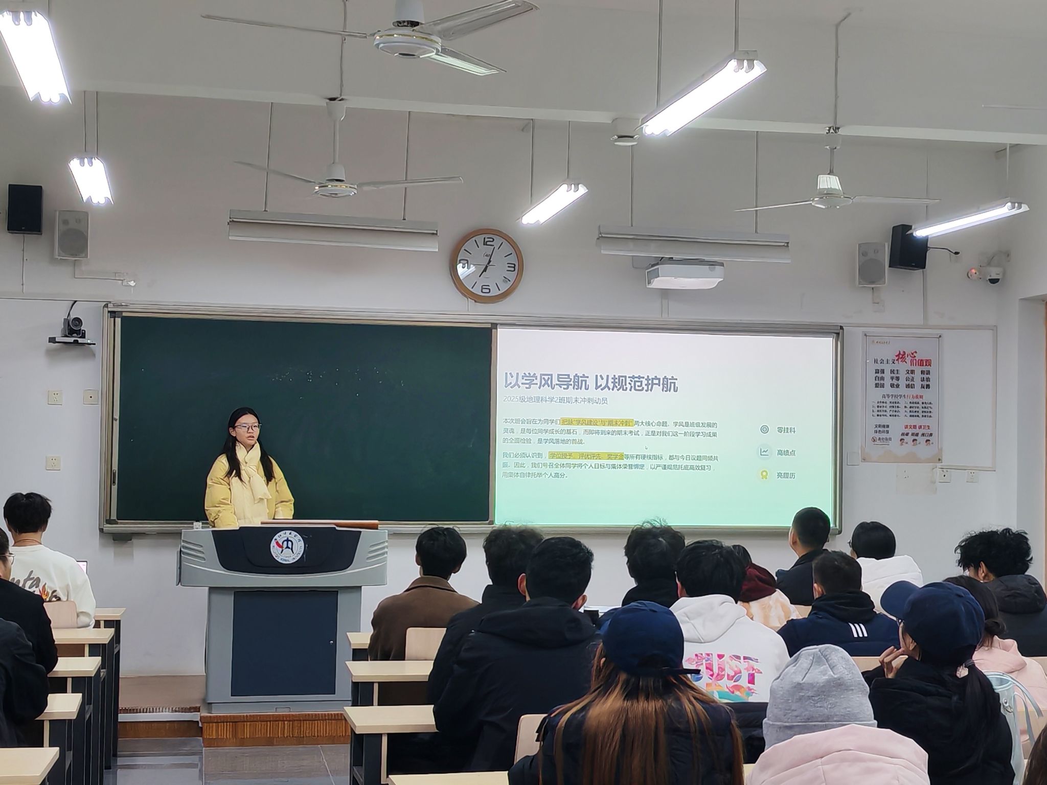 为引导学生明晰学业发展方向、科学备战期末考试、牢固树立诚信意识,地测25.2班于2025年12月9日在明德楼B314举行专题班会,围绕“学业规划、期末备考、诚信考试”三大主题展开深入交流。班会特邀23.2班优秀学生杨林燕、班主任蒋景龙老师共同参与,分别从学生视角与教师角度为同学们答疑解惑、指引方向。