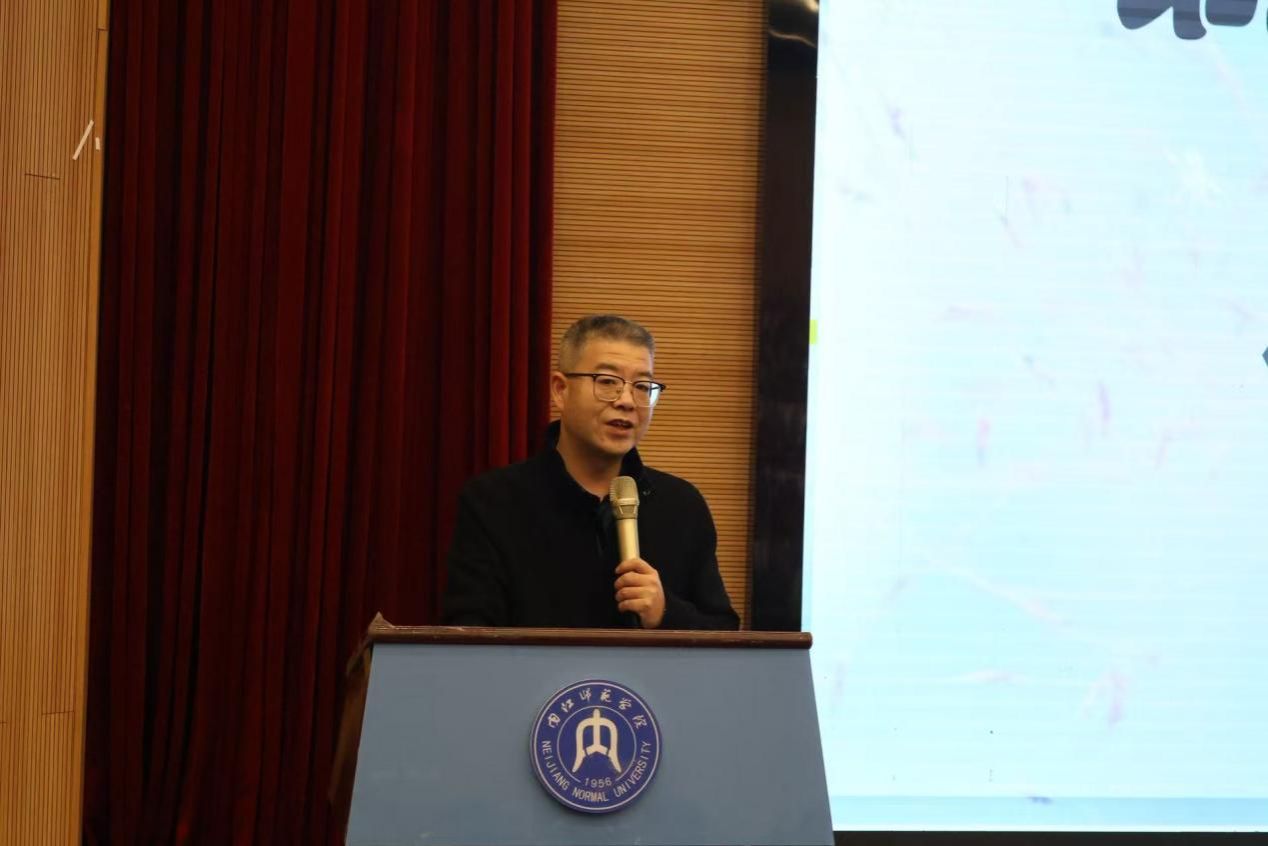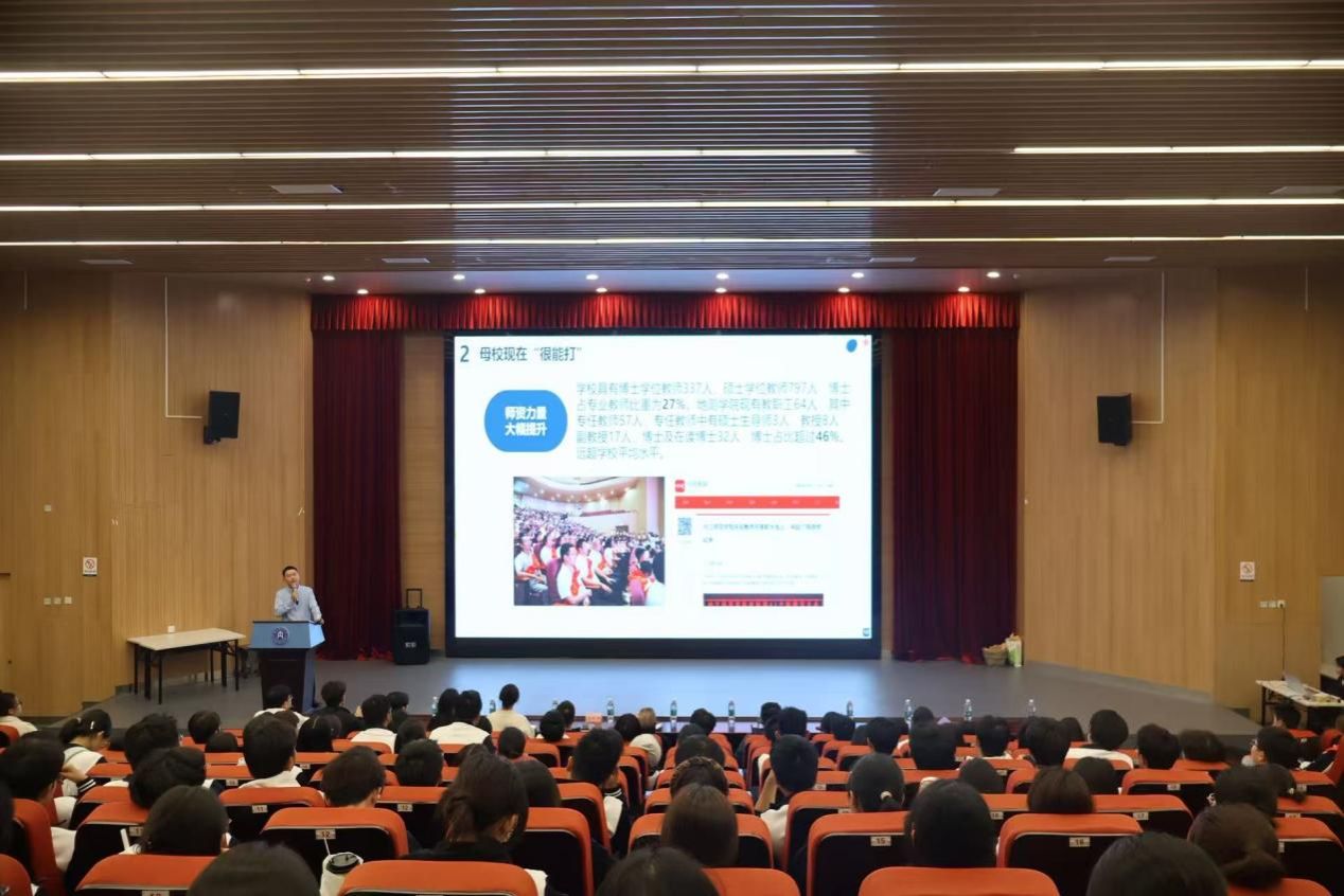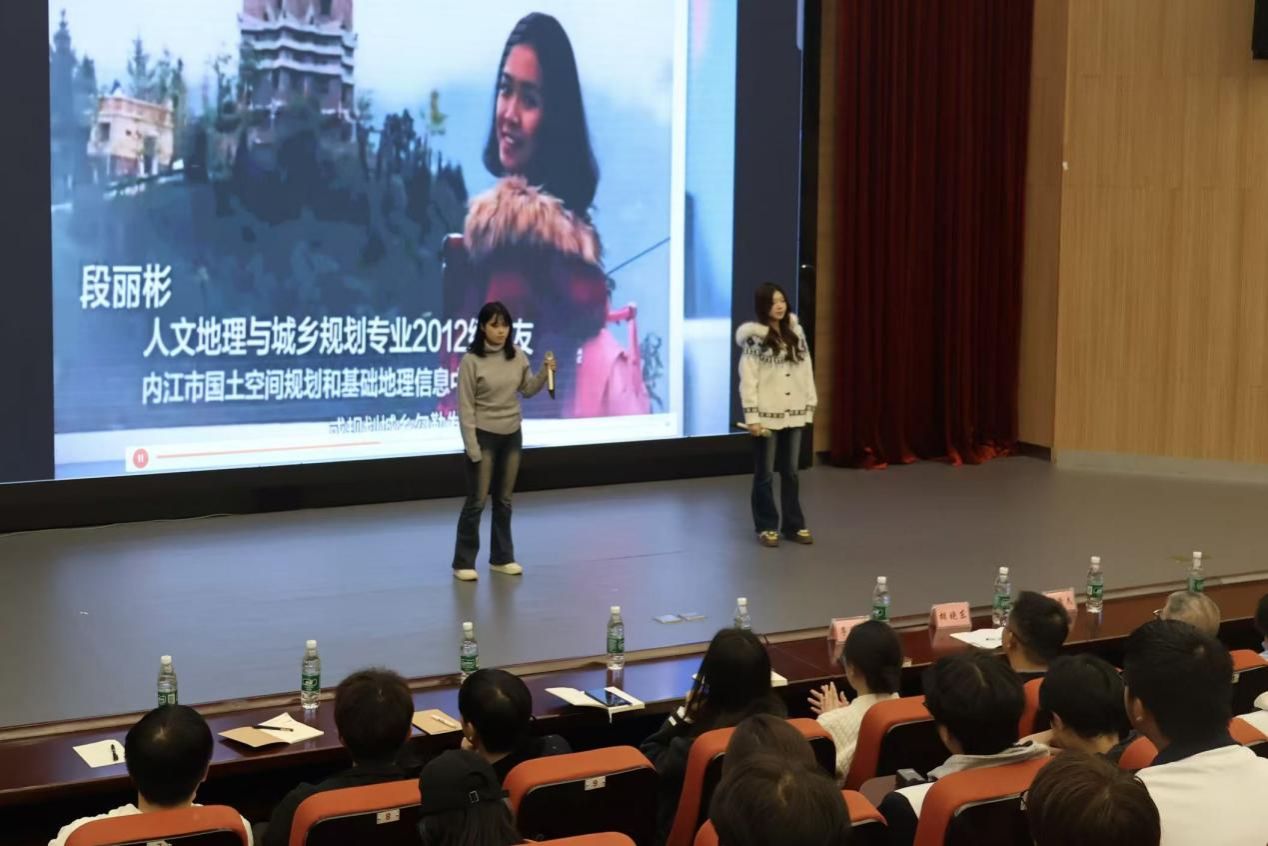 “初心回溯”环节,地理科学专业2006级校友苟懿(现任职于成都市郫都区第四中学)分享了扎根教育一线、践行“教育报国”理想的成长历程,诠释了内师学子的责任担当;蒋景龙主任作为优秀校友,作了题为《从这里出发,向更远的地方——母校故事与大学规划》的分享,在回忆过往点滴学习中感谢母校的培养,通过对当前学校发展成绩的分享,呼吁师弟师妹们要努力学好专业知识,练就过硬本领,与内师共奋进、共发展。同时,老校区影像资料、珍贵老照片展播与校史讲述相结合,带领师生回溯学校1905年建校以来的百年脉络,让大家在光影中感受校园文化底蕴,增强归属感与认同感。