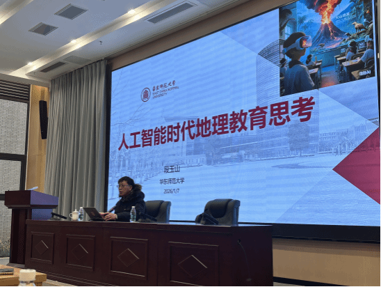 2026年1月7日上午,我国地理教育领域权威专家、中小学地理国家教材建设重点研究基地主任、中国教育学会地理教学专业委员会理事长、《地理教学》杂志主编、华东师范大学段玉山教授应学院邀请莅临学校,在会议中心小报告厅做了题为《人工智能时代地理教育思考》的精彩学术报告,地测学院院长蒋乾主持,学院部分教师、内江市中学地理骨干教师及地理科学专业学生100余人参加。