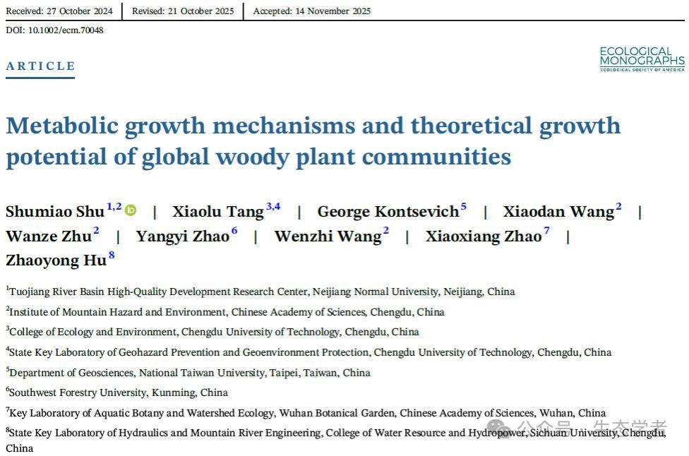 近日,地理与测绘科学学院教师舒树淼博士作为第一作者,在国际生态学领域以研究深度著称的顶级期刊《Ecological Monographs》发表研究成果。该研究围绕全球森林生物量增长与碳汇形成的基础理论问题,提出了具有整体性和可推演性的解释思路。
