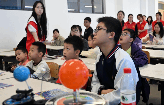 随后,活动的“镜头”从“地下”延伸至“天上”。在天文科普环节,老师们首先借助天球仪和转动星图,为同学们揭开了星空分布的神秘面纱。理论知识铺垫后,大家有序地通过天文望远镜观测遥远的地物,为天文观测奠定基础。在天象厅内,借助天文软件逼真的星空模拟画面与科普影片,四季星空的运行规律等抽象知识变得直观而生动,仿佛璀璨银河被搬到了眼前。