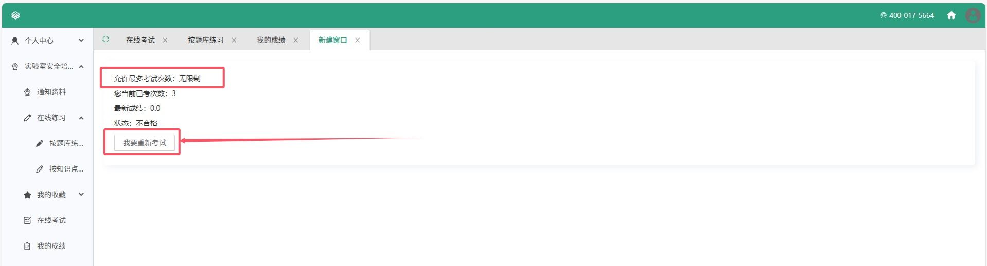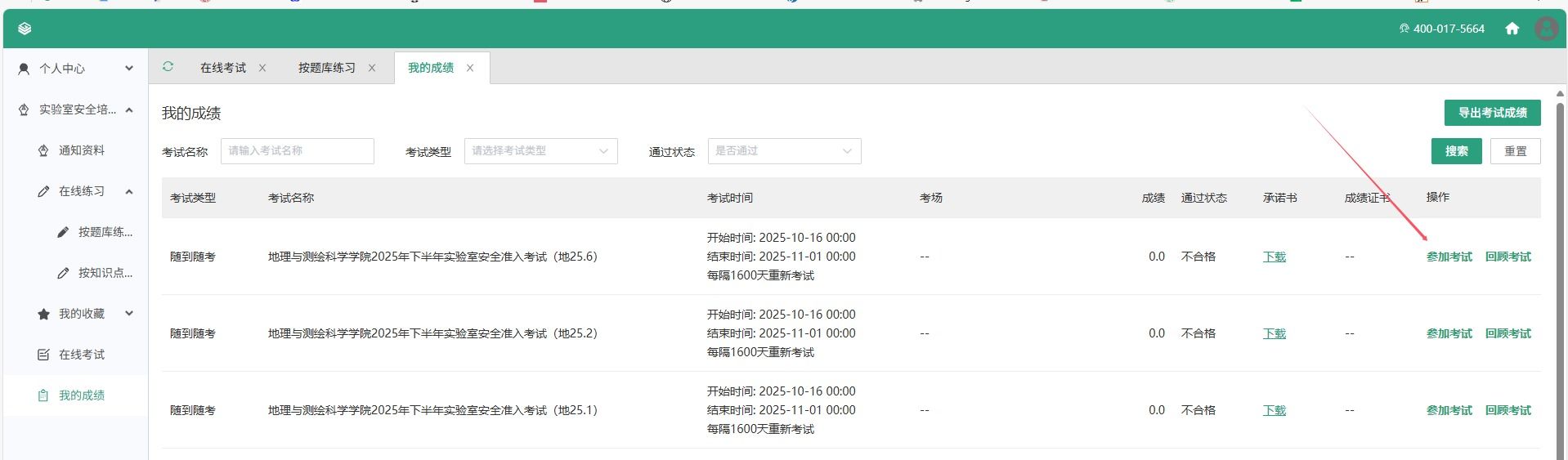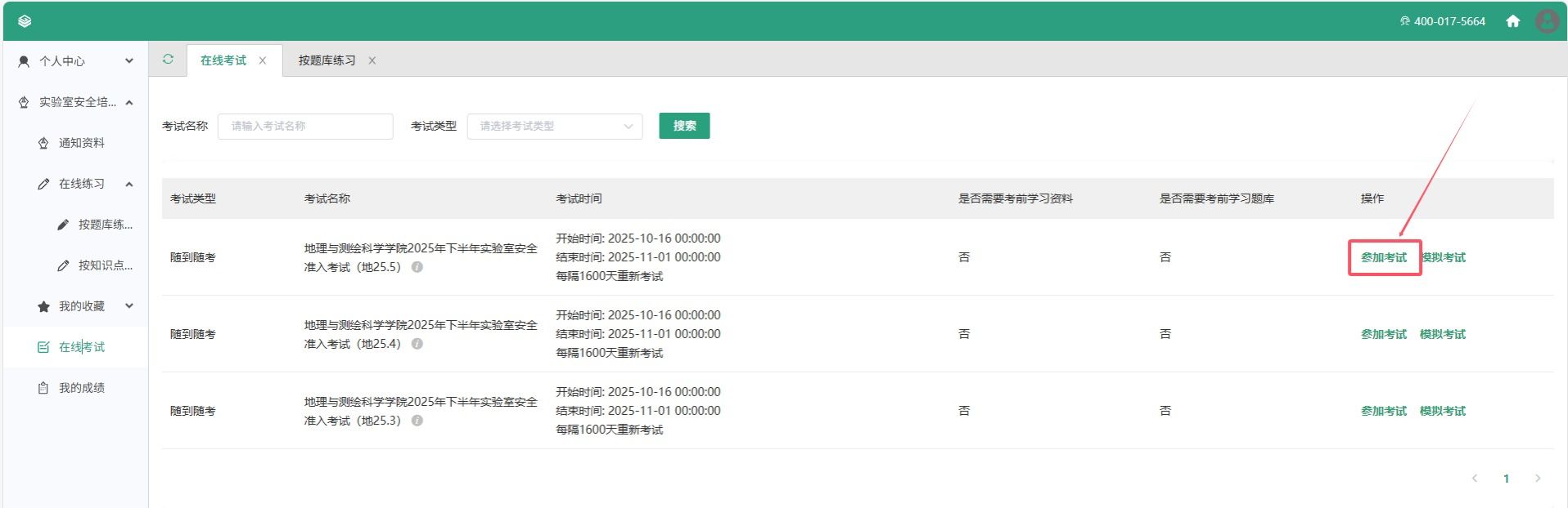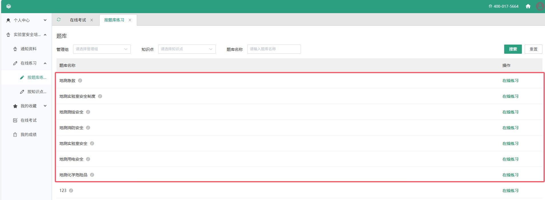 进入考试系统后,可通过“在线练习”栏目下“按题库练习”,浏览带“地测”两字的实验室安全相关资料及题库。